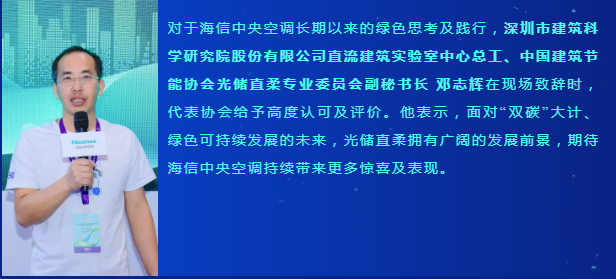 对于海信中央空调长期以来的绿色思考及践行,深圳市建筑科学研究院股份有限公司直流建筑实验室中心总工、中国建筑节能协会光储直柔专业委员会副秘书长 邓志辉在现场致辞时,代表协会给予高度认可及评价。他表示,面对“双碳”大计、绿色可持续发展的未来,光储直柔拥有广阔的发展前景,期待海信中央空调持续带来更多惊喜及表现。