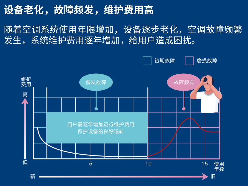 然而,许多老旧建筑面临着空调系统老化,故障频发;能效水平低,效率低下;性能下降,使用效果差;异味重,噪音大;技术落后、用户体验差、维护成本高、冷媒不环保等问题。