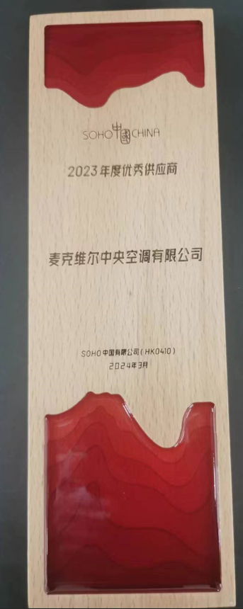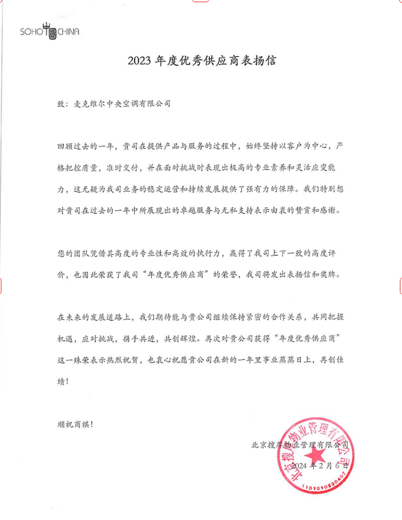 “贵司在提供产品与服务的过程中,始终坚持以客户为中心,严格把控质量,准时交付,并在面对挑战时表现出极高的专业素养和灵活应变能力,这无疑为我司业务的稳定运营和持续发展提供了强有力的保障。”近日,SOHO中国颁给麦克维尔“2023年优秀供应商”荣誉,并发来表扬信。