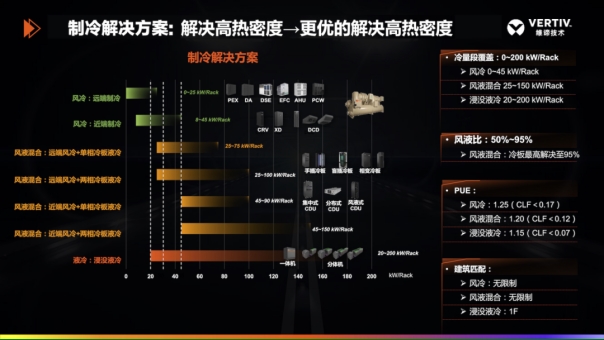 维谛技术采用“风液结合”的技术路线,提供了全场景全品类的解决方案,从芯片制冷到户外散热,解决高热密度难题。