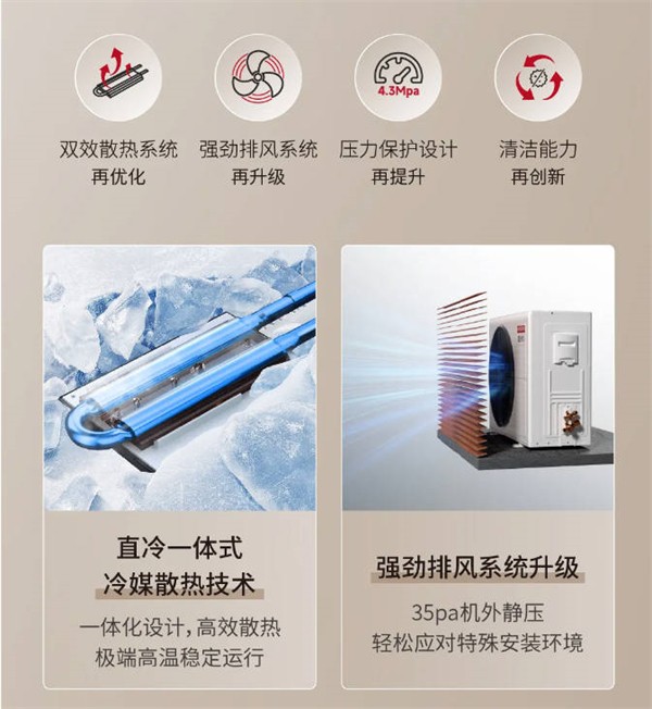 全系1级节能,击退“电费刺客”。全系采用全直流变频技术,能效均超国家一级标准,APF值最高可达6.0,高效节能。通过新一代宽频高转速压缩机、高效波纹宽翅片换热器、大直径轴流风扇等实现舒适省电,为你精打细算。
