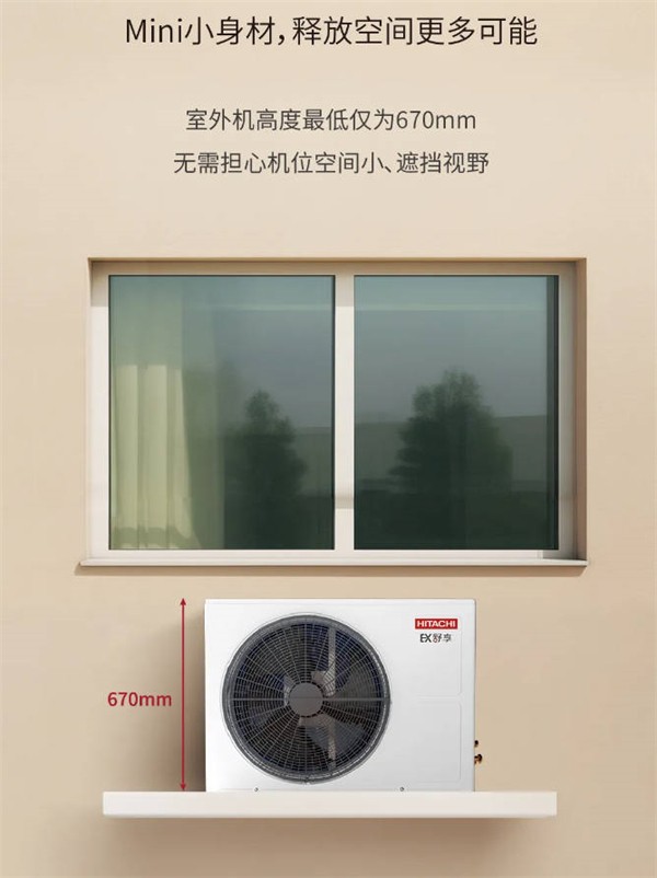 室外机高度最低仅为670mm。无需担心机位,空间小、遮挡视野。