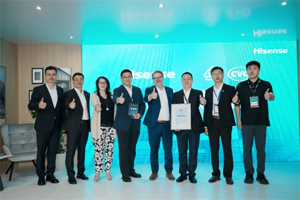 而欧洲作为海外热泵的热销地,北欧、德国、英国北部等地与漠河地处相似维度,海信Hi-Therma ATW Heat Pump R32 Split系列产品更以冷暖双高效、节能硬实力成为海外明星产品,深受青睐。9月7日上午,德国VDE董事会成员Sven Öhrke先生亲临海信展台,为海信热泵产品颁发编号为No.001的认证证书。海信日立公司常务副总裁张文强、海信日立副总裁李友波出席现场,共同见证这一激动人心的荣耀时刻!