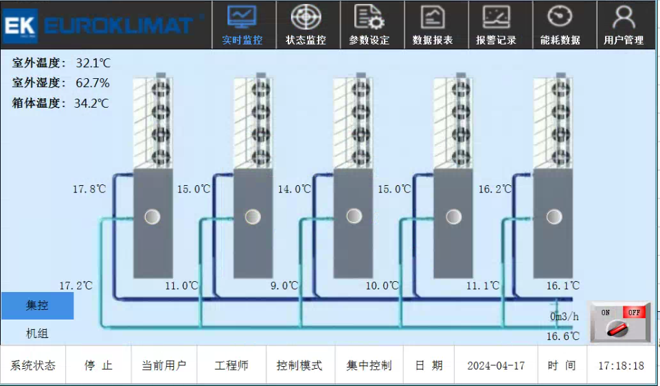 本着节能环保的理念, EK专业技术人员经过与客户充分的沟通,最终确定项目冷源采用EKWR系列分布式云智慧高效集成冷站方案,并设计五台集中控制系统。