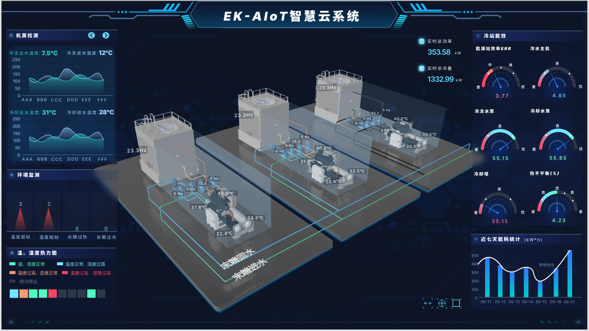 云智慧高效集成冷站结合高效机房设计理念标准化BIM三维设计,加入了高效机房控制系统及能耗能效检测,为客户提供EK-AIoT智慧云平台控制功能,可以远程控制与监测,确保机组高效运行,为客户降低全生命周期使用成本,缩短客户投资回报周期。
