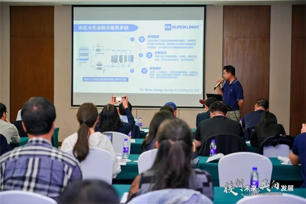 在演讲中,古正中详细介绍EK间接蒸发冷却机组、无油悬浮多联蒸发冷机组和一体式蒸发冷螺杆冷水机组等绿色低碳系统方案,为行业带来EK空调在蒸发冷技术方面的思路和解决方案。