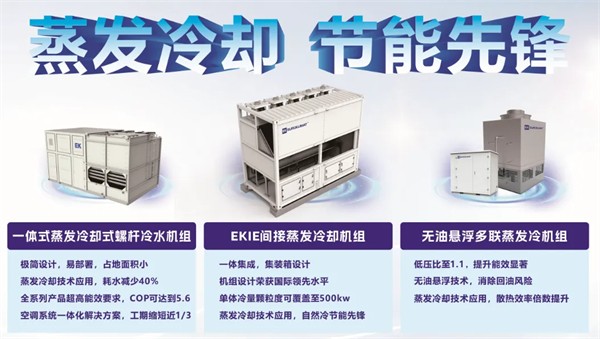 其中,间接蒸发冷却机组适用于大型数据中心和自然冷源充足区域;无油悬浮多联蒸发冷机组适用于中大型数据中心和末端改造需求场景;而具有高效节能、节省项目周期、运用灵活、安装快捷、提高工程质量等特点的一体式蒸发冷螺杆冷水机组,则是电子电力、轨道交通、新能源和生物制药等场所冷源的理想选择。