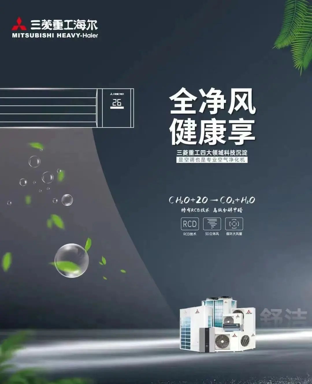 三菱重工海尔全净风空调,不仅让您的新家温度适宜,更搭载了日本三菱重工特有的RCD甲醛净化技术,为您的新家高效去除甲醛阴霾!