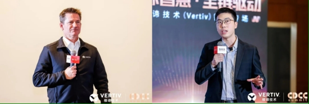 世纪互联研发总监杜华锐与维谛技术中国区研发部总监张迪,展示了双方联合研发的最新成果,包括全国最大规模分体式氟泵无水制冷技术应用,以及行业首台交直流一体驱动风墙空调。