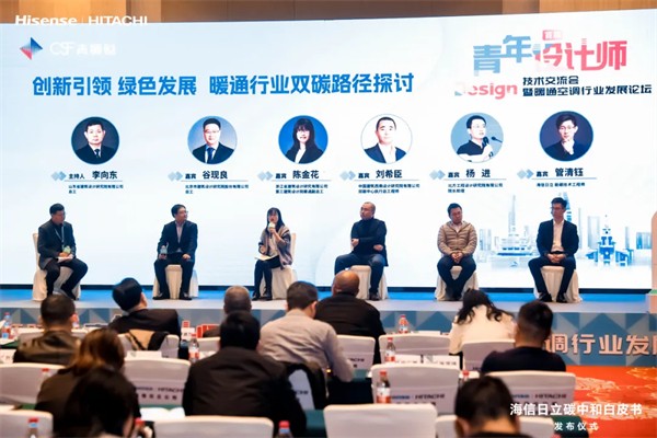 “创新引领、绿色发展,暖通行业双碳路径探讨”论坛环节,山东省建筑设计研究院有限公司总工 李向东为主持人,北京市建筑设计研究院股份有限公司总工 谷现良,浙江省建筑设计研究有限公司第三建筑设计院暖通副总工 陈金花,中国建筑西南设计研究院有限公司双碳中心执行总工程师 刘希臣,北方工程设计研究院有限公司院长助理 杨进,以及海信日立能碳技术工程师 管清钰作为论坛嘉宾,聚焦行业节能降碳切入点、科技创新发力点、绿色供应链生态建设、绿色产品创新、企业管理制度等多元维度,结合《海信日立碳中和白皮书》带来的启示,充分碰撞思想火花,共探绿色发展更多智慧与实现路径。
