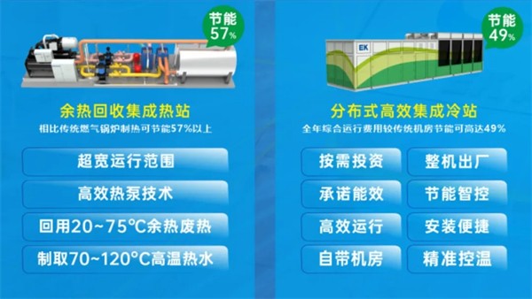在工业冷、热源方面,EK工业空调的绿色低碳系统方案同样表现出色。EK余热回收集成热站相比传统燃气锅炉制热可节能57%以上,基于高效机房理念推出的分布式高效集成冷站EERa高达6.0。