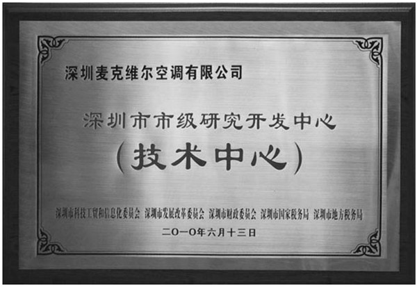 2010年,深圳麦克维尔空调有限公司获深圳市市级研究开发中心(技术中心)认定