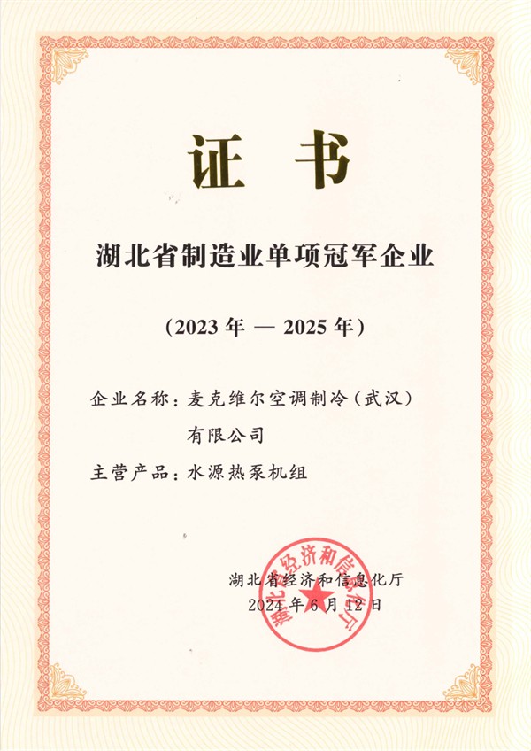 此次荣获“2024年度湖北省制造业单项冠军”称号,不仅是对麦克维尔水源热泵等产品的技术、性能和品质的认可,更是对长期坚持创新、专注服务市场的肯定。