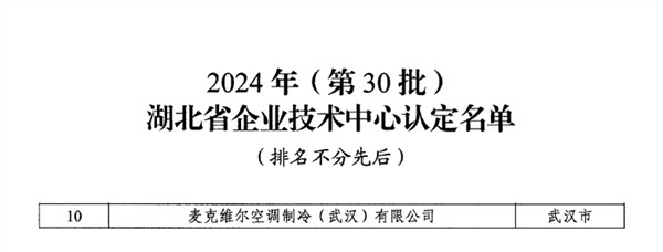 近日,湖北省发改委公布了2024年(第30批)新认定湖北省企业技术中心名单,麦克维尔空调制冷(武汉)有限公司凭借在新产品创新、专业技术服务等领域的研发实力,一次性通过评审,成为省级企业技术中心。
