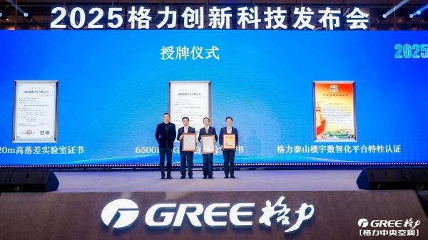 中央空调体积大,检测环节多,测试实验室对产品质量具有深远的影响。峰会现场,中国制冷空调工业协会会长李江,为格力120米高落差实验室、6500RT水冷综合实验室、泰山楼宇数智化平台特性认证授牌,确保产品在安全性、可靠性、应用性、舒适性和节能性等方面达到高标准。