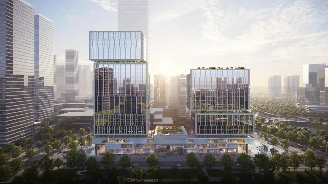 成都交子公园金融产业园五期,由东西双子塔组成,以“跳动交子”为设计理念,创造了三种维度的“跳动”公共空间:总部室内公共空间、商业公共空间和户外公共空间,建筑的整体形象刚劲有力,其中又点缀着成都的跳动和活力