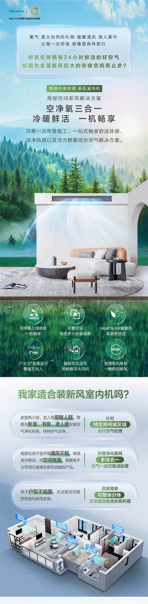 海信中央空调新风室内机局部空间新风解决方案,空净氧三合一,冷暖鲜活,一机畅享,只需一次布管施工,一站式畅享舒适体感,洁净风感以及活力鲜氧综合空气解决方案。