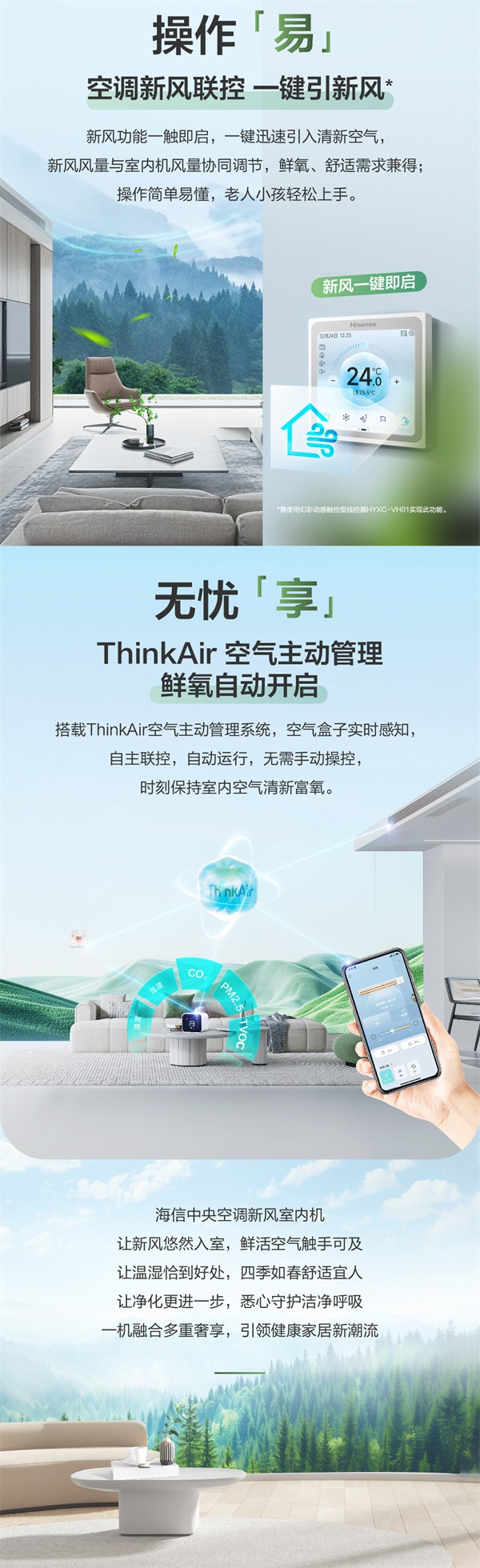 海信中央空调新风室内机让新风悠然入室,鲜活空气触手可及让温湿恰到好处,四季如春舒适宜人让净化更进一步,悉心守护,洁净呼吸一机融合多重奢享,引领健康家居新潮流。
