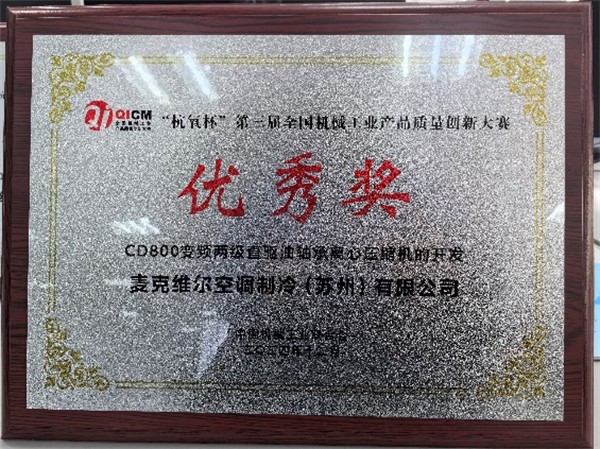 麦克维尔空调制冷(苏州)有限公司的“CD800变频两级直驱油轴承离心压缩机的开发”、“WMT800高效双级磁悬浮离心压缩机拓宽运行范围的开发”、“3-10高转速变频风冷单螺杆压缩机的开发”三个项目获得优秀奖。