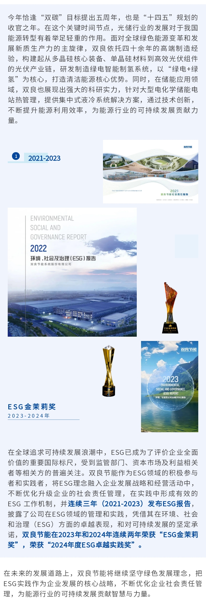 会上,凭借在ESG领域的卓越成就,双良节能系统股份有限公司荣获“2025中国ESG影响力品牌”,这一荣誉是双良节能长期以来坚定不移地坚持绿色发展理念、积极主动履行社会责任的有力见证,彰显了公司在可持续发展道路上的执着追求和卓越贡献。
