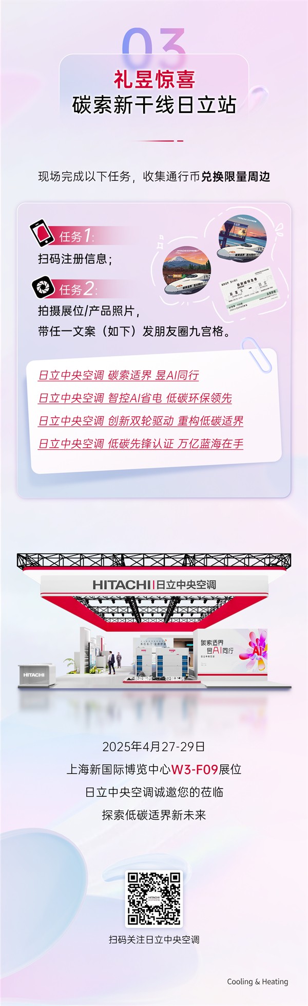 2025年4月27-29日,上海新国际博览中心W3-F09展位,日立中央空调诚邀大家莅临探索,低碳适界新未来。