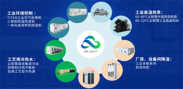 针对行业痛点,EK工业空调可提供覆盖工业环境控制、工艺用冷热水、工业高温热泵、厂房/设备间降温等工业应用场景的工业环境控制产品阵容,搭载EK-AIoT工业物联网能源优化平台,以更节能高效、绿色低碳、智能运维的温控解决方案构建绿色智慧高精制造环境控制,为现代工业提供转型支点。