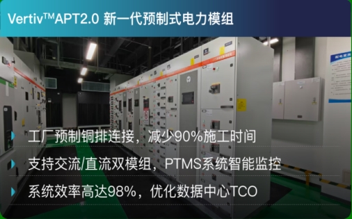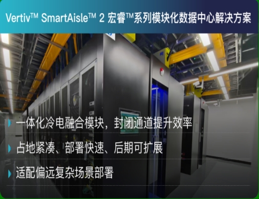 在拥有多元化优势产品的基础上,维谛技术(Vertiv)将这些产品无缝集成至Vertiv™ Smart Aisle™2宏睿™系列模块化数据中心解决方案,实现冷电联动深度融合满足负载需求,而且基于封闭冷通道大幅优化PUE,同时现场吊装即用最大程度缩短部署周期。