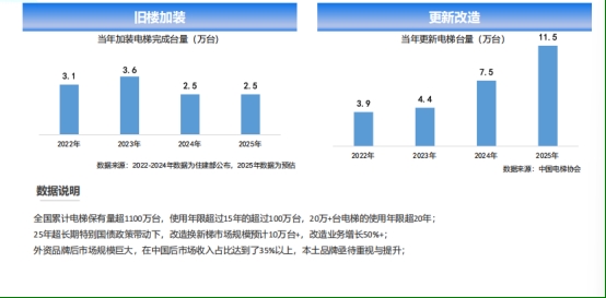 不过,这并不意味着电梯市场步入冬季。《中国电梯协会》公布数据显示,目前全国累计电梯保有量超1100万台,其中使用年限在15年以上的超过100万台,超20年则在20万台以上。随着国家层面积极推动既有建筑节能改造和大规模设备更新,旧梯改造、换新的存量蓝海已然显而易见。