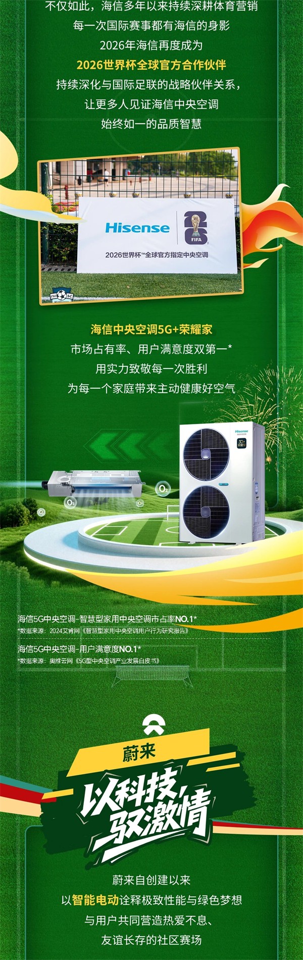 不仅如此,海信多年以来持续深耕体育营销,每一次国际赛事都有海信的身影。2026年海信再度成为2026世界杯全球官方合作伙伴,持续深化与国际足联的战略伙伴关系,让更多人见证海信中央空调始终如一的品质智慧。
