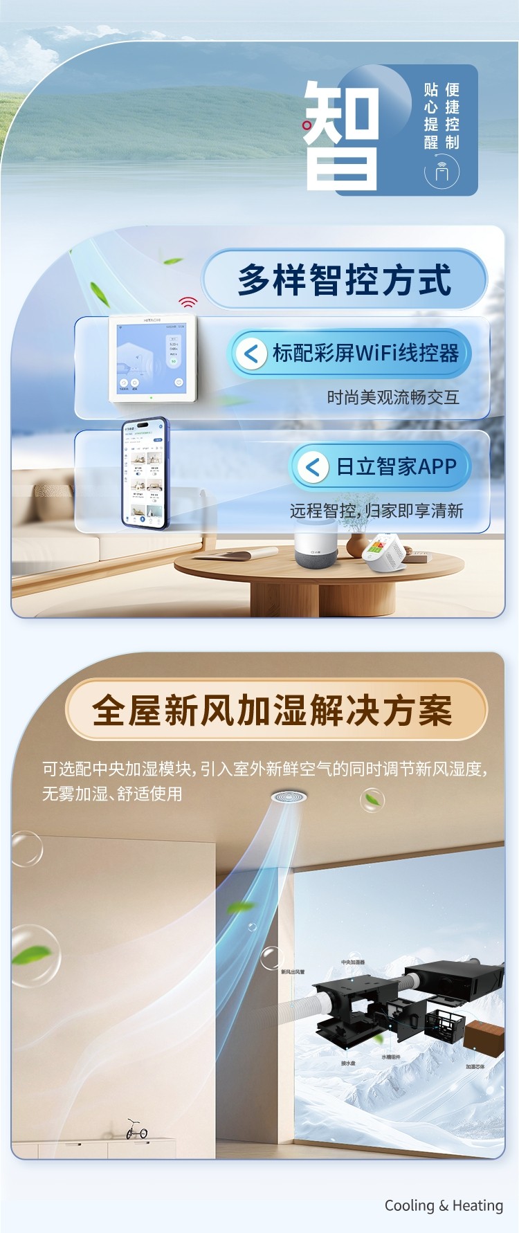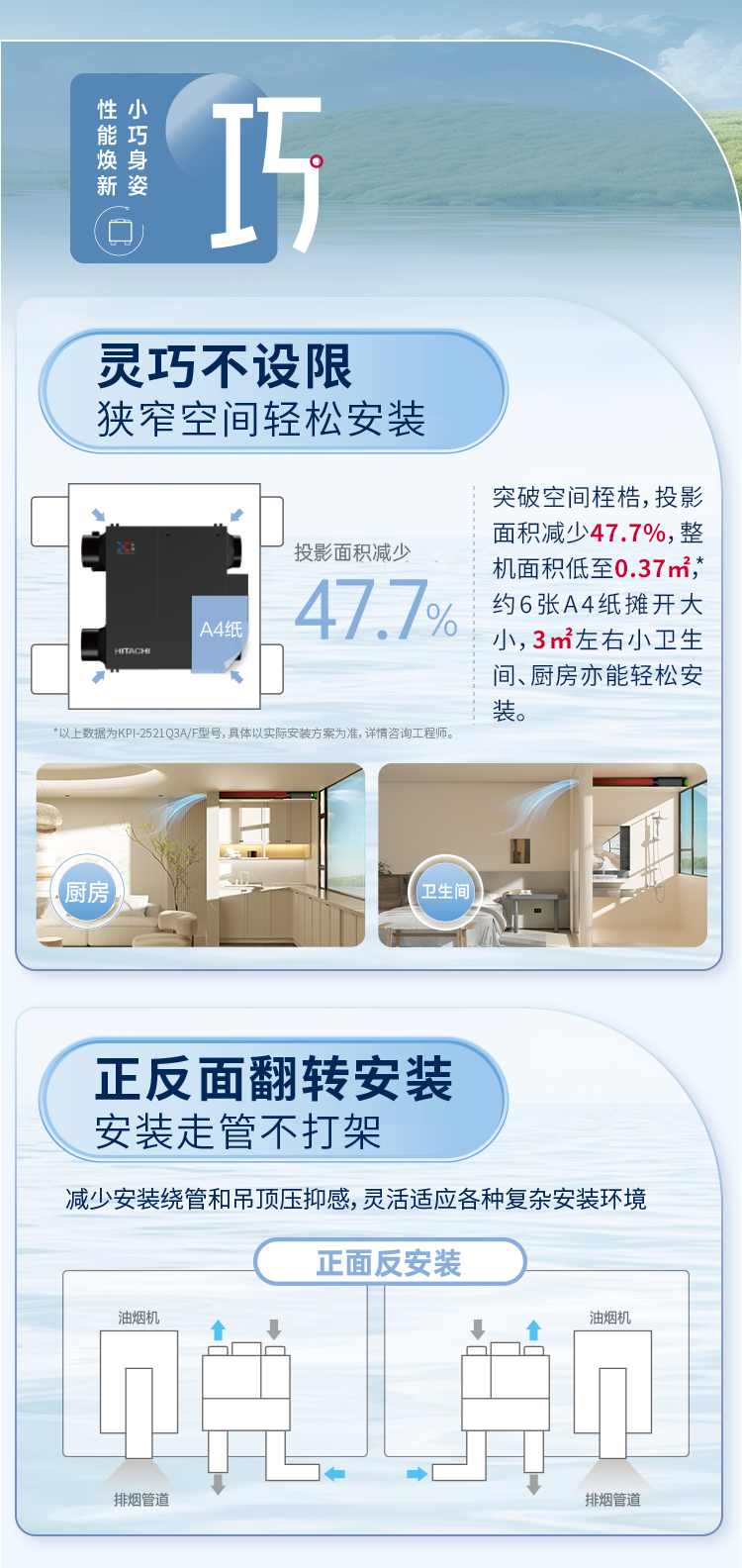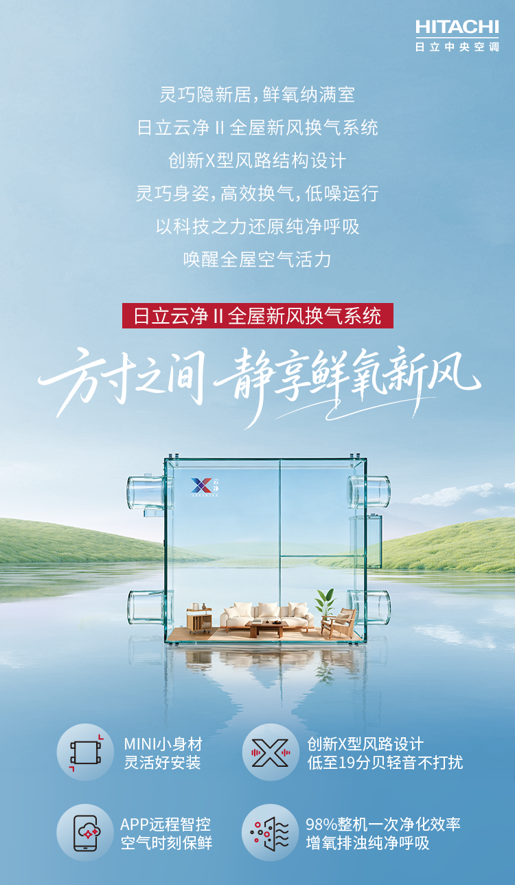 灵巧隐新居,鲜氧纳满室。日立云净Ⅱ全屋新风换气系统创新X型风路结构设计,灵巧身姿,高效换气,低噪运行,以科技之力还原纯净呼吸,唤醒全屋空气活力。日立云净Ⅱ全屋新风换气系统,方寸之间静享鲜氧新风。