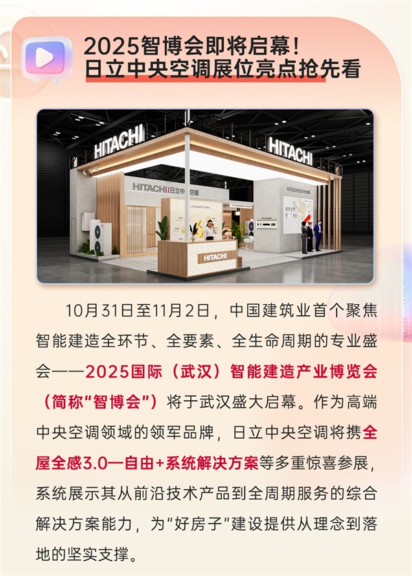 10月31日至11月2日,中国建筑业首个聚焦智能建造全环节、全要素、全生命周期的专业盛会--2-2025国际(武汉)智能建造产业博览会(简称“智博会”)将于武汉盛大启幕。作为高端中央空调领域的领军品牌,日立中央空调将携全屋全感3.0一自由+系统解决方案等多重惊喜参展系统展示其从前沿技术产品到全周期服务的综合解决方案能力,为“好房子”建设提供从理念到落地的坚实支撑。