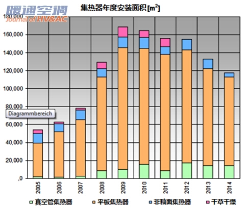 在集热器技术中,真空管是近些年唯一一类呈现增长态势的集热器。2014年,新真空管集热器面积达到14 403平方米,增幅2.8%。这可以被看作消费者重拾对此类产品的信心。