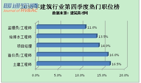 2015年基础设施建设、楼市回升不断蓄热建筑行业,也为人才助力。据英才网联旗下建筑英才网招聘数据显示,截至2015年第四季度,建筑行业的人才需求量较去年同期相比上涨11%。在职位方面土建工程师、造价员/工程师、项目经理、给排水工程师、监理员五个职位成为今年第四季度的热门职位。