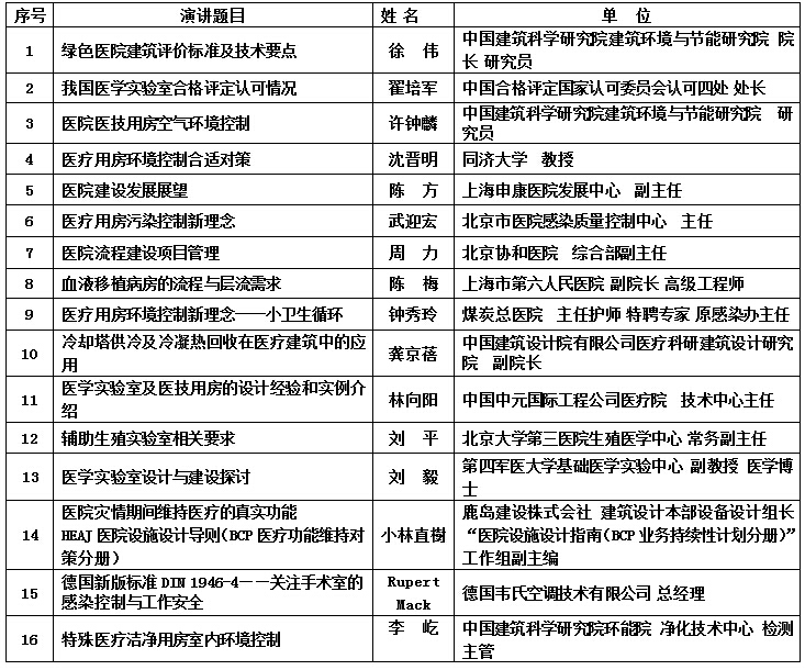 第2届医疗用房环境控制技术国际论坛国内、国外主要专家演讲题目