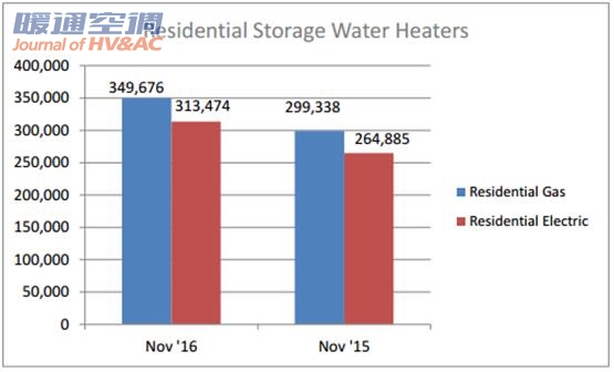 2016年1-11月,美国家用燃气热水器的销售总量为3,821,921台,比去年同期的3,992,228台下降了4.3%。家用电热水器的销售总量为3,592,628台,比去年同期的3,691,380台下降了2.7%。