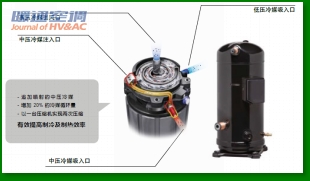 传统定频热泵系统在低温环境下工作很不理想,在这种背景下,产生了喷气增焓技术。喷气增焓技术是以喷气增焓压缩机为基础,优化了中压段冷媒喷射技术。该压缩机除了常规的排气口和吸气口外,还具有第二个吸气口,即蒸汽喷射口。中压的制冷剂蒸气通过蒸汽喷射口和位于静涡盘的喷射孔喷射到涡盘的中间腔,以增加系统制冷剂有效流量,结合带经济器的系统设计,达到增加系统制热量,、提高压缩机的效率,同时提高运行可靠性的目标。