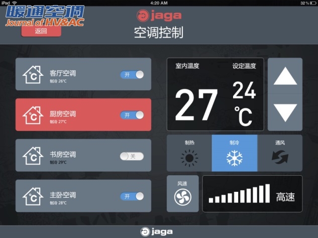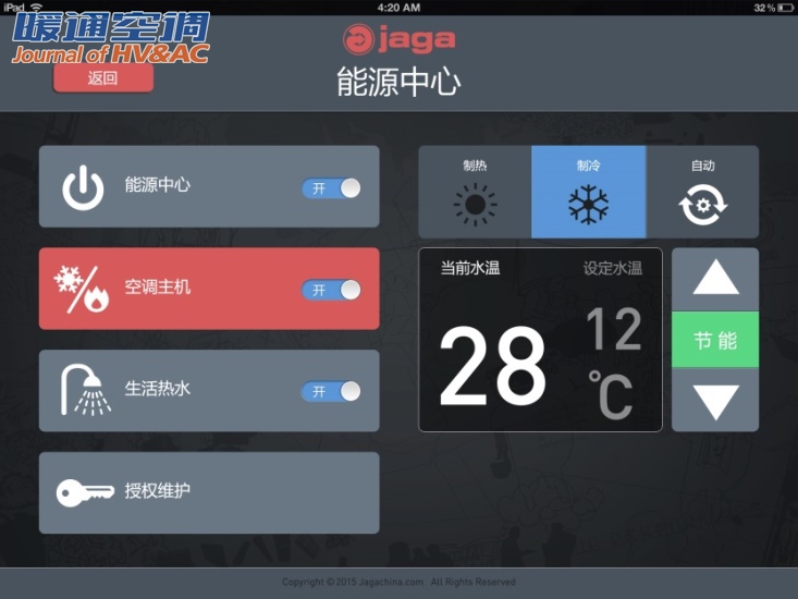 JAGA为裸心提供的智能控制界面见下图。能源中心界面,控制主机开启/关闭,设置出水温度;空调界面,控制不同区域的空调开启/关闭,设置温度;在能耗监测界面可以查看客人入住后到离开的总耗水,耗电数据。