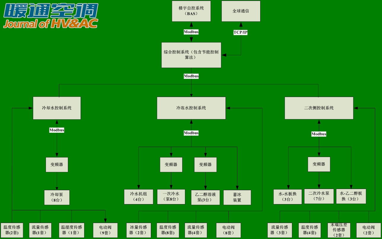 项目位于银川市北部阅海新区,总建筑面积约为48万平米。系统夏季设计冷负荷为29773kW,系统设计热负荷为40681kW。本系统空调供冷供热面积大,为满足大温差集中供冷热的需求,供冷冷源采用移峰填谷的冰蓄冷制冷,供热热源采用115/70℃一次锅炉热源水,分别集中设置在动力站内的制冷机房及锅炉房。系统由双工况水冷离心式冷水机组、水冷离心式冷水机组、乙二醇溶液泵、一次空调冷源水泵、二次冷水泵、冷却水泵、冷却塔、热水锅炉、蒸汽锅炉、热水循环泵、高效集成冷热源控制系统等设备组成。