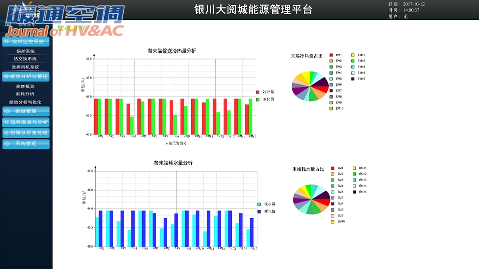 4)设有一套节能信息化服务系统。运用网络技术,与运维体系服务站、客户端控制系统配合,实时监测并记录全国各地所有冷热源系统的运行工况,并提供冷热源系统故障诊断、隐患检测、故障报警、实时系统COP数据、运行节能分析、能效评级等运行维护信息化服务。以全面的系统实时运行数据为基础,分析系统中各设备的性能曲线和最佳工作点,对于存在运行隐患、偏离最佳工作点的设备进行自动关联调节,实现冷热源系统的智能控制;根据各设备的运行数据,提出合理的维护和维修建议;能够为管理人员提供全面的能效分析和系统管理建议。运用智能运维预警系统,能够有效提高系统稳定性、可靠性,实现冷热源系统的智能化管理。