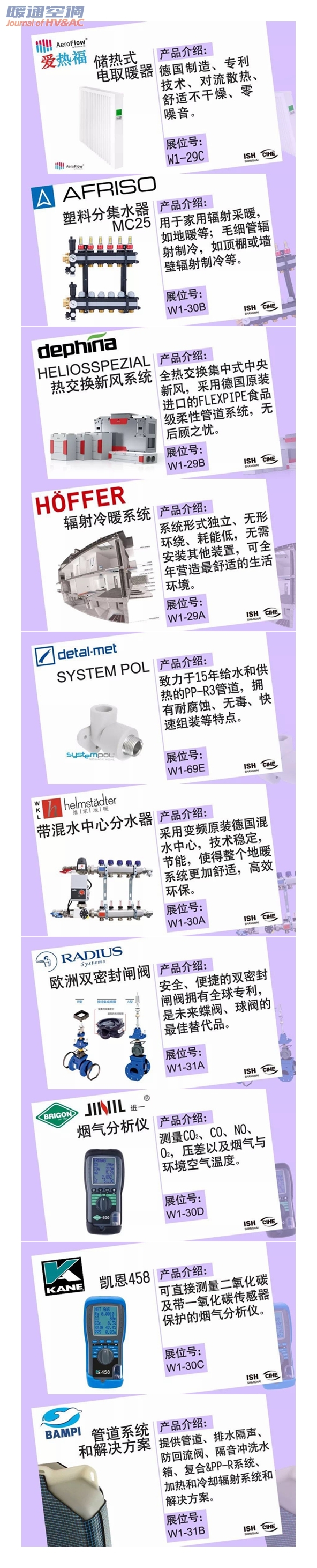 欧洲展团已确认的品牌有:爱热福、霍弗尔、德菲兰、维家、KANE、培根、菲索、威迪斯、Bampi、Detal-Met 。汇聚了辐射冷暖系统、储热式电取暖器、烟气分析仪、地暖管道及分集水器等产品。