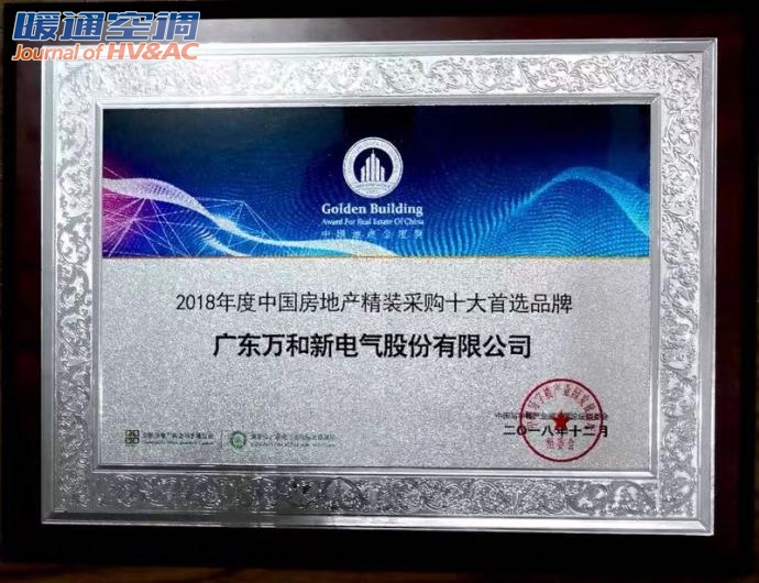 广东万和新电气股份有限公司凭借先进的节能技术,完善的产品解决方案和系统服务体系,获得广大地产企业一致认可,荣膺中国地产金厦奖年度部品企业——“2018年度中国房地产精装采购十大首选品牌”、“2018年度中国房地产绿色供暖最具实力品牌”两项荣誉。