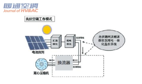 中央空调变频离心机组利用三元换流等技术,集成了光伏逆变器功能,形成了发用电一体化中央空调主机。该系统主机选用永磁同步变频离心机组,IPLV 达到11.68,在此基础上再进行光伏能直驱供电,实现发、用电双高效、双节能。