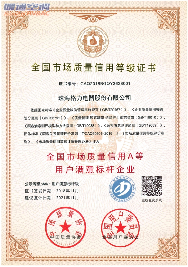 近日,中国质量协会在2018满意中国年会上公布了全国市场质量信用A等企业名单,格力电器荣膺“用户满意标杆企业”(市场质量信用等级:AAA),展示了格力电器在产品质量、诚信经营、创新发展等维度均受到了消费者的认可,在构建以用户为中心的消费模式上成果显著。