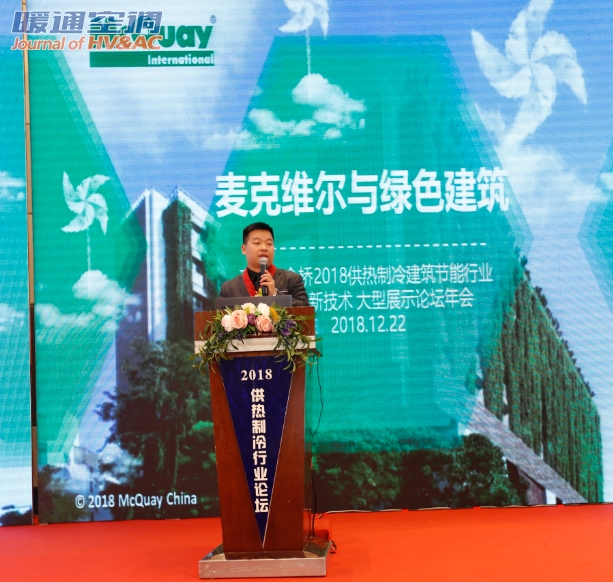 会上,麦克维尔空调制冷(武汉)有限公司市场部经理魏永建先生分享了《麦克维尔与绿色建筑》主题演讲。通过对绿色建筑的发展现状介绍,麦克维尔产品绿色环保、高效节能等特点阐述,及多个绿色建筑应用的深入剖析,向大家展示了麦克维尔在建筑节能行业的产品优势和为技术革新作出的努力。