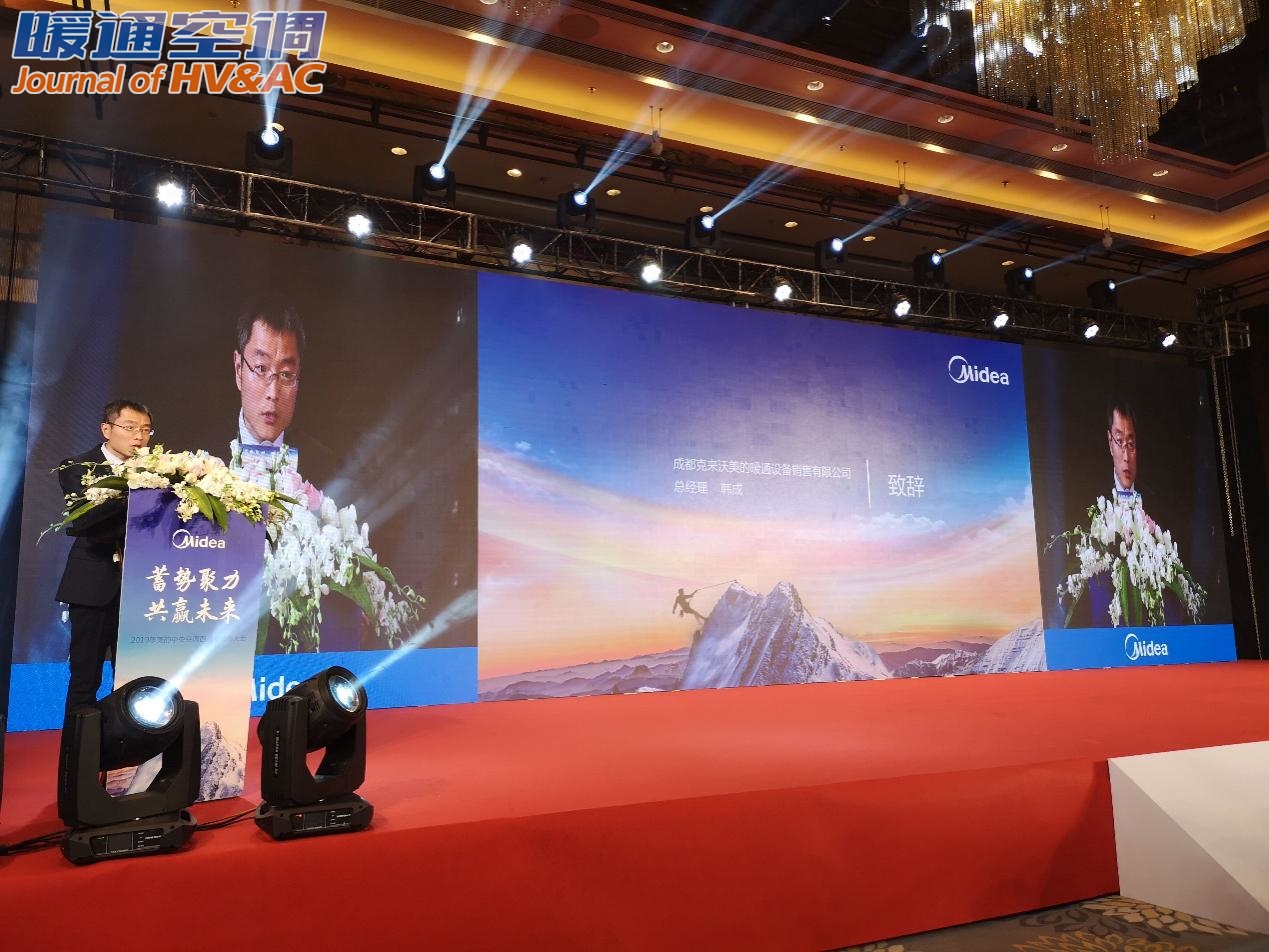 大会伊始,由成都克来沃美的暖通设备销售有限公司总经理韩成先生致辞。韩总回顾了2018年美的中央空调在四川取得的优异成绩,同时规划了2019年的布局,希望与经销商朋友们携手共创辉煌。