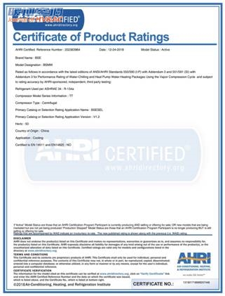 2018年12月,必信空调一次性通过了严格而专业的现场测试,取得了美国空调、供热及制冷工业协会AHRI(The Air-Conditioning,Heating,and Refrigeration Institute)认证。