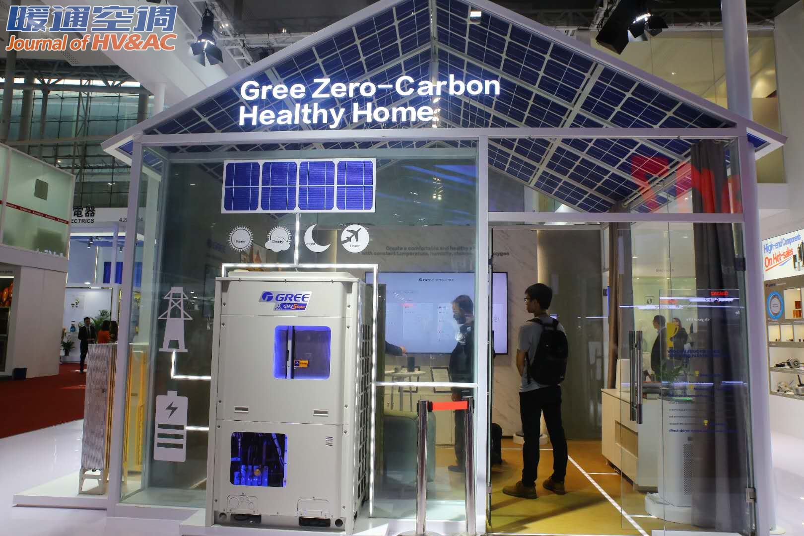 “光伏能源系统由光伏板、储能柜、光伏空调、用电设备等组成,其内核支撑是光伏直驱、三元换流及绿色变频等三大技术。独特的光伏直驱技术为智能产品提供清洁能源,实现光伏直驱利用率高达98%,为用户带来‘零碳’生活。三元换流技术则建立起由光伏板、光伏空调以及公共电网三者构建成的三元换流模型,使得电能在直流侧可双向流动,多路混合。这样一来,在晴天日照充足的情况下,光伏板发电供给空调等用电设备,多余的电能储存在储能柜中或者回馈电网;如果是阴雨天、晚上等日照不足的情况,该系统则优先使用储能电能,从而实现了动态切换能源运行模式,切换时间低至2.6ms,既保证了高效用电,且能避免余电浪费,从根本上保障了能源的自给自足。此外,该系统还采用了四象限全控整流技术,实现高质量用电,减少谐波的不利影响,保证室内家电设备不受干扰。”广交会现场的格力工作人员向大家介绍道。