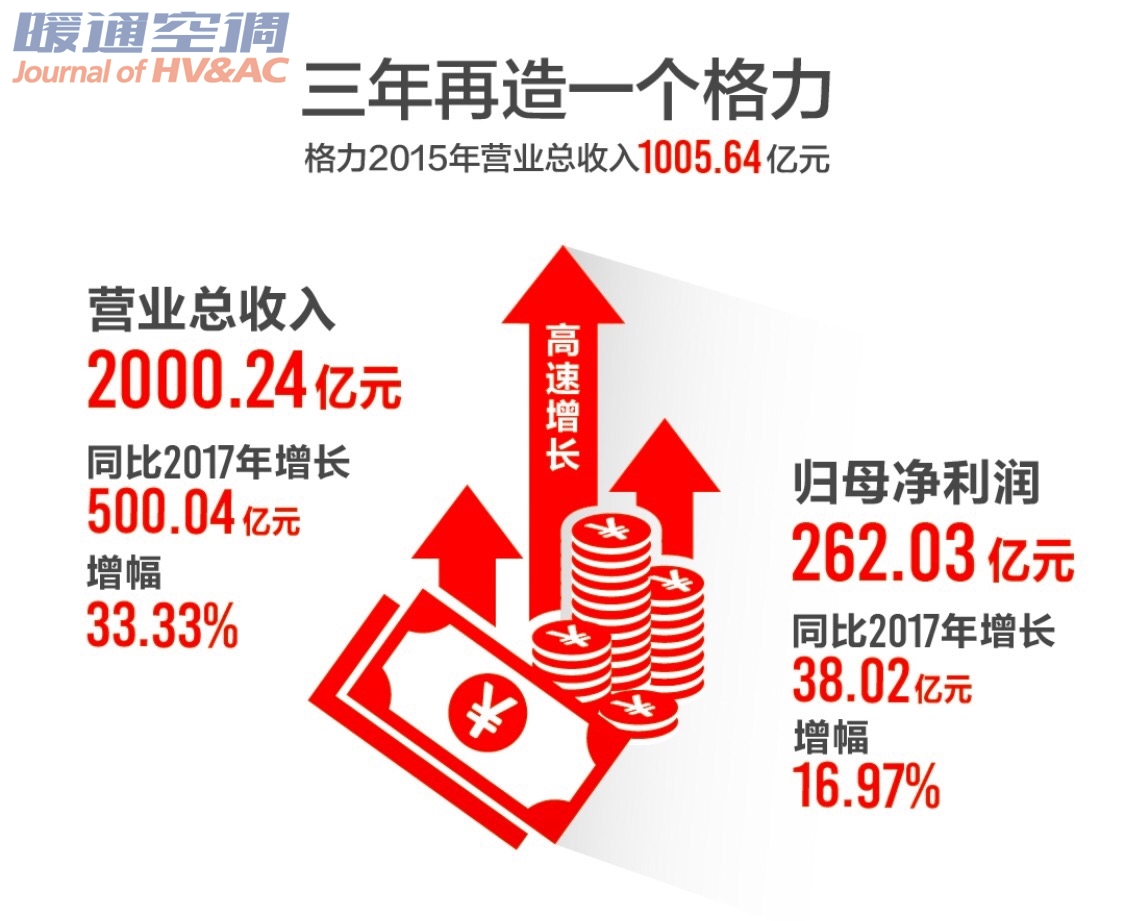 4月28日晚间,格力电器发布《2018年年度报告》。报告显示,2018年公司实现营业总收入2000.24亿元,同比增长33.33%;实现归属上市公司股东净利润262.03亿元,同比上涨16.97%。其中,智能装备、生活电器两大板块表现十分亮眼,分别实现46.19%和64.9%的高速增长。相较于2015年1005.64亿的营收额,格力在三年内实现了营收翻倍,等同于“再造了一个格力”。