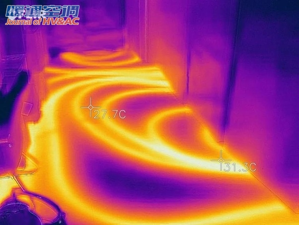 第三步:检测发现图中某个点温度高于其他位置,同时该处红外热图成聚集状态,不是传统的管路形状,重点观测该高温区的变化情况发现,该高温区面积逐步扩大,属于典型的漏水现象,至此,我们已经明确锁定了盘管漏水点,接下来就是等待维修师傅来处理啦!(冷热水管道同理哦)
