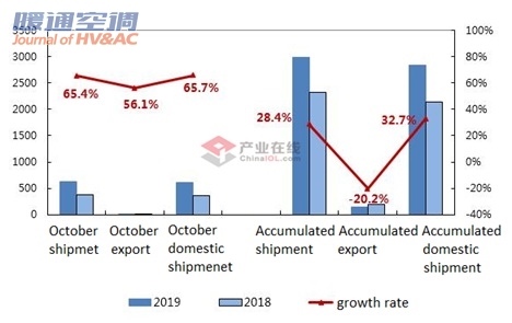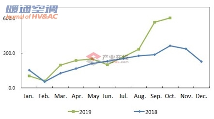 China gas-fired wall-mounted boiler totaled to 623,000 units in October of 2019, with a growth rate of 65.4%. Among them, the domestic shipment and export increased 65.7% and 56.1% to 606,000 units and 17,000 units, respectively. The accumulated shipment in January to October increased 28.4% to 2,985,000 units. Among them, the domestic shipment increased 32.7% to 2,833,000 units and export decreased 20.2% to 152,000 units.